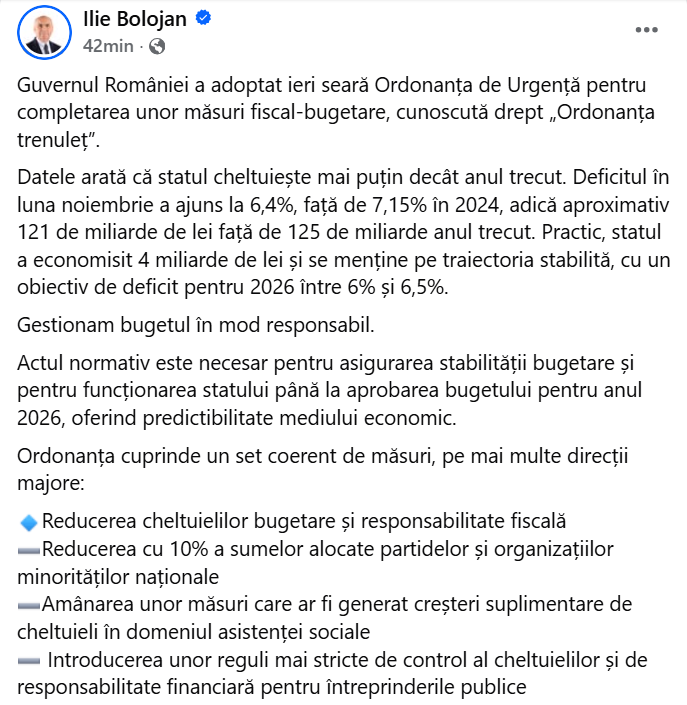 Prin aceste măsuri, Guvernul asigură un buget echilibrat în 2026, sprijină investițiile și creșterea economică și protejează stabilitatea fiscală.” – a anunțat premierul Ilie Bolojan pe Facebook.