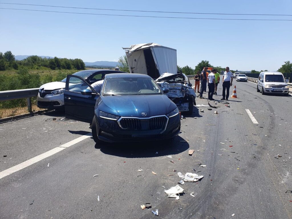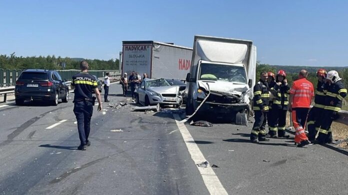 Pe autostrada A1 Deva-Nădlac, la kilometrul 427, pe sensul de mers spre Deva, în zona localității Margina, județul Timiș, a avut loc o coliziune între cinci autoturisme, un autotren și o autoutilitară, vineri, în jurul orei 12:00.