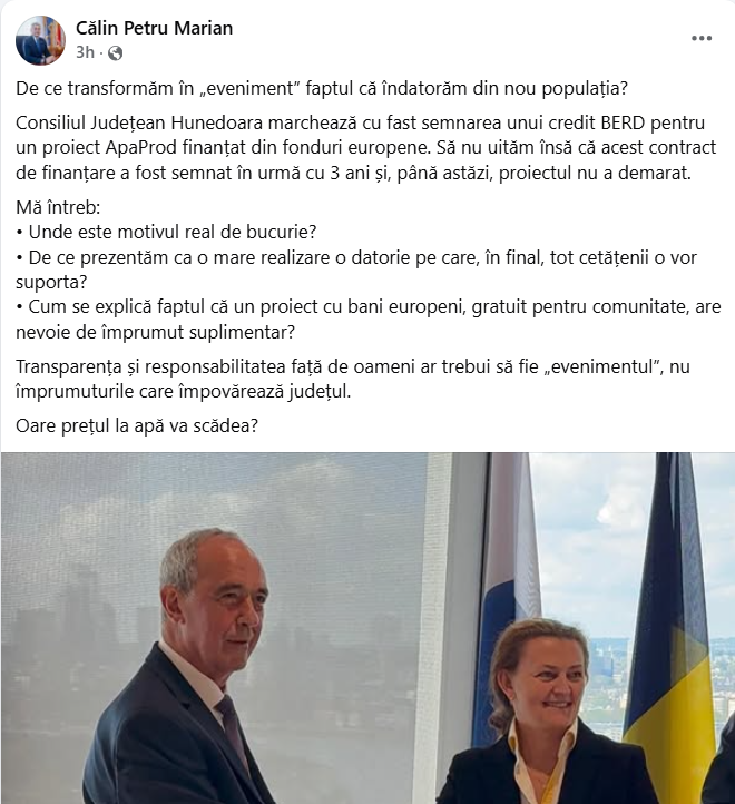 Hunedorenii nu au nevoie de lecții de economie ținute pe Facebook, ci de apă curată la robinet și de rețele moderne de canalizare. Acestea nu se obțin cu sloganuri, ci cu finanțări concrete. Iar creditul de la BERD reprezintă exact ceea ce lipsește din discursul domnului senator: responsabilitate, soluții și o legătură reală cu valorile europene.